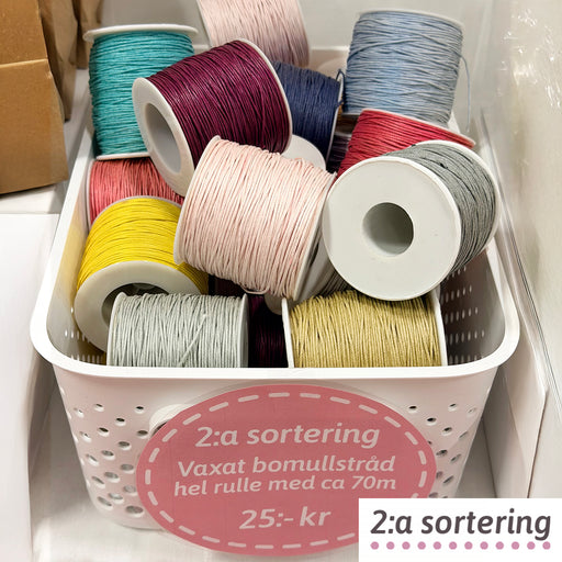 Vaxat bomullssnöre. Hel rulle på ca 70m.Tjocklek är ca 1 mm.Färgen kan inte påverkas. Du får en helt slumpmässig färg.Ej lämplig för barn under tre...