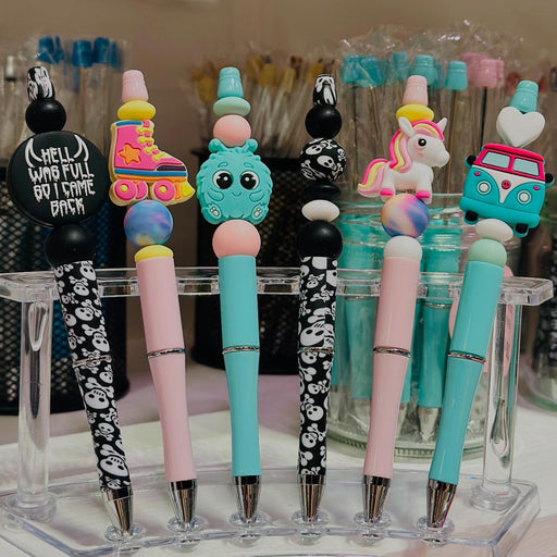 Visa fullständig informationPärlbar penna i akryl.Pennan skriver med svart färg.Öppningsbar stav med skruvlås.Perfekt för att göra din helt personliga penna med dina favoritpä...