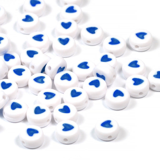Platta, runda pärlor i akryl, vita med blått hjärta på båda sidor.Storlek är ca 7 x 4 mm.Håldiameter är ca 1 mm.Priset avser en påse med ca 100st.E...