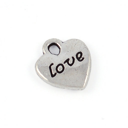 Antikt silverfärgad berlock, hjärta med ordet "love" på båda sidor.Storlek är ca 10 mm (plus ögla).Tjocklek är ca 2 mm.Håldiameter är ca 1,5 mm.Pri...