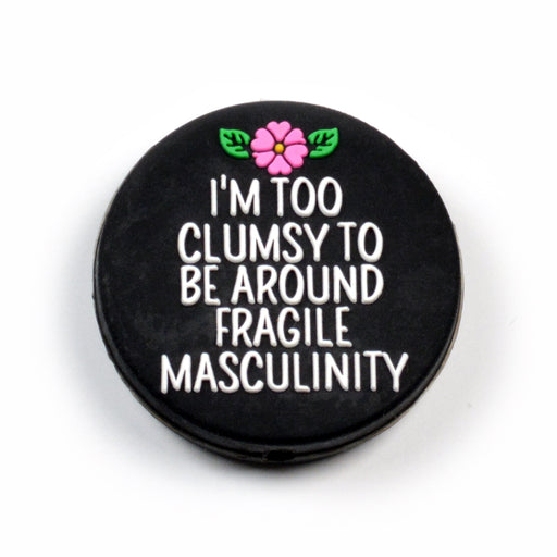 Rund silikonpärla, svart med orden "I'm too clumsy to be around fragile masculinity", BPA-fritt silikon för små kliande tänder. Funkar även utmärkt...