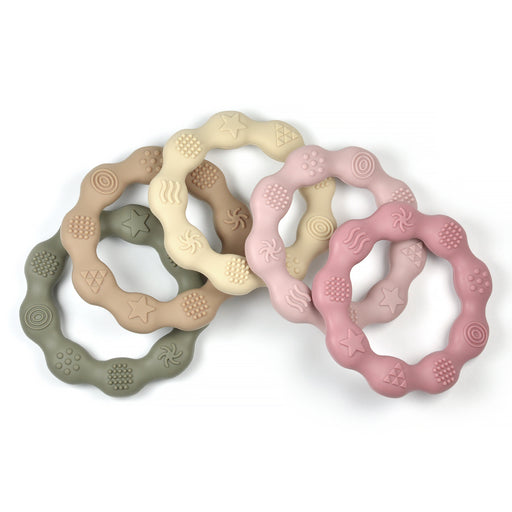 Bitring i rund form med bubblor runtom som har olika noppor för små kliande tänder.100% BPA-fritt silikon.Passar perfekt som bitleksak eller vagnhä...