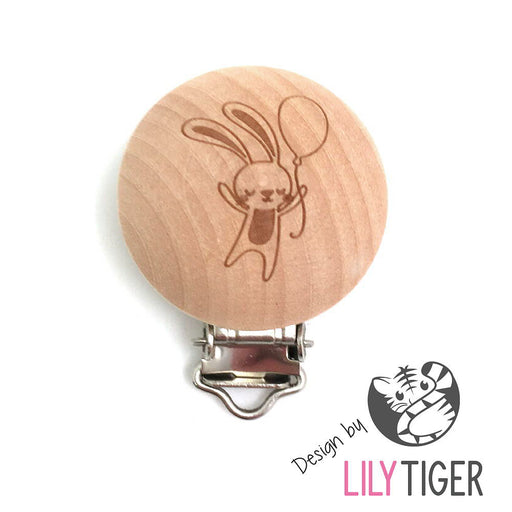 Clips i obehandlat trä med ingraverad kanin med ballong.Design by LilyTiger.Diameter på clipset är ca 35 mm.Priset avser 1 st.Enskild produkt är in...