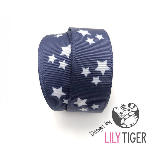 Marinblått ripsband med vita stjärnor. Egendesignat från band LilyTigerBredd: 22mmAngivet pris avser 1 meter band.Enskild produkt är inte lämplig f...