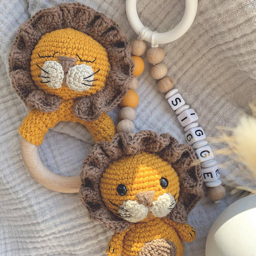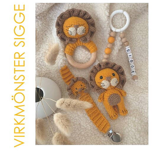 3-i-1-mönster för skallra, hänge & napphållare med fina lejonet SIGGE.Mönstret är skapat av vår samarbetspartner Ninni Sjökvist (@ninnisvirksta...