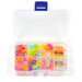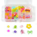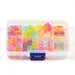 Liten pyssellåda med akrylpärlor i glada, transparenta färger.