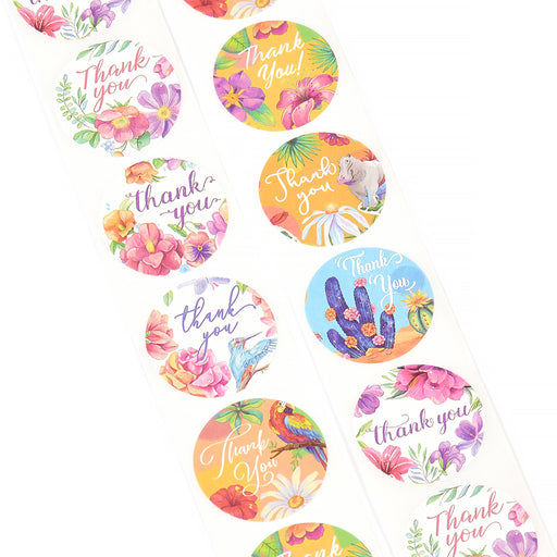 Runda klistermärken med olika tropiska motiv som blommor, kaktus eller papegoja och texten "thank you".Det är 8 olika design på klistermärken.Diame...