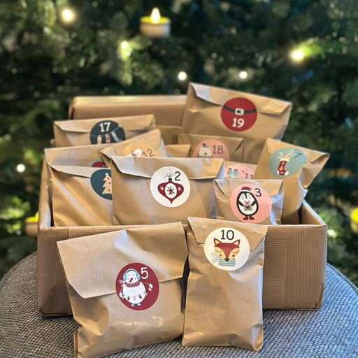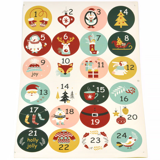 Runda, juliga klistermärken till jul / adventskalender med söta motiv och siffrorna 1–24.Diameter per klistermärke är ca 45 mm.Hela arken är ca 20 ...