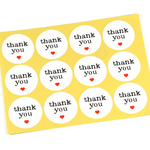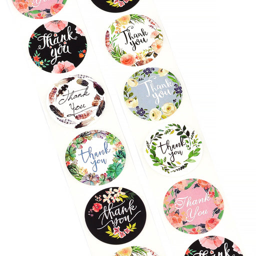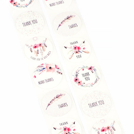 Runda, vita klistermärken med olika motiv som t.ex. blommor eller fjädrar och texten "thank you" eller varianter till den.Det är 6 olika design på ...