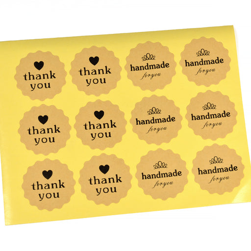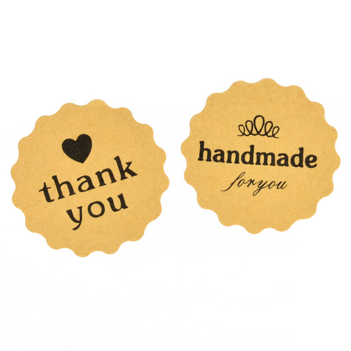 Naturfärgade, runda klistermärken med räfflade kanter.Två olika varianter på varje ark med texten "thank you" och "handmade for you".Diameter per k...