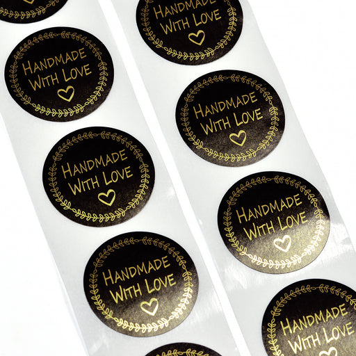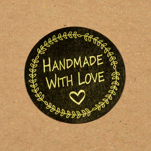 Svarta, runda klistermärken med guld-metallic text "Handmade with love".Diameter är ca 25 mm.Priset avser 20st klistermärken.Ej lämplig för barn un...