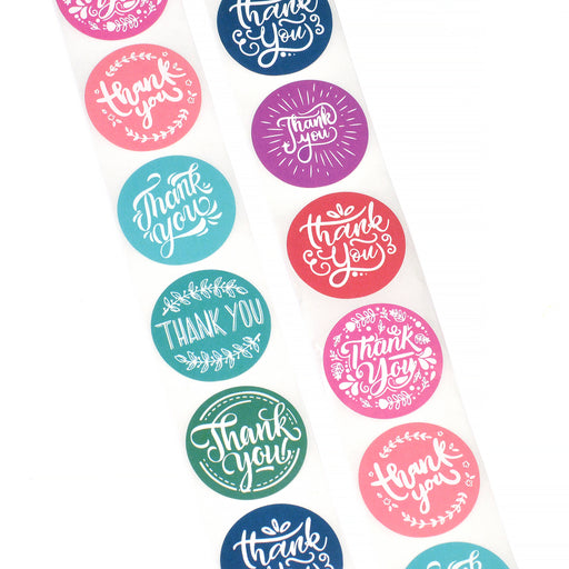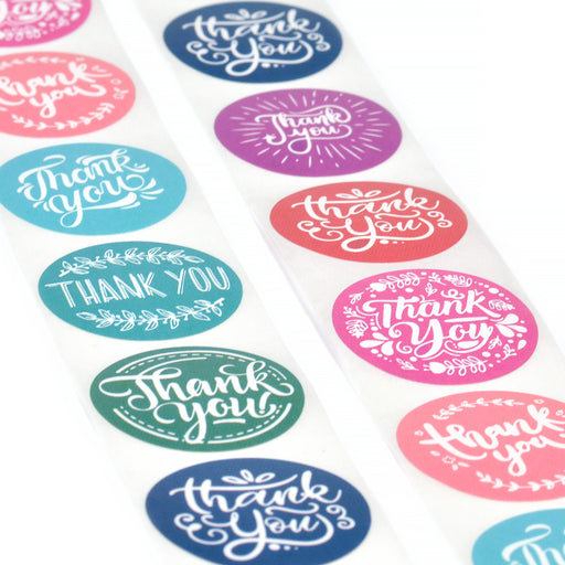 Runda klistermärken med texten "thank you" i olika typsnitt och glada färger som bakgrund.Det är 8 olika design på klistermärken.Diameter är ca 25 ...