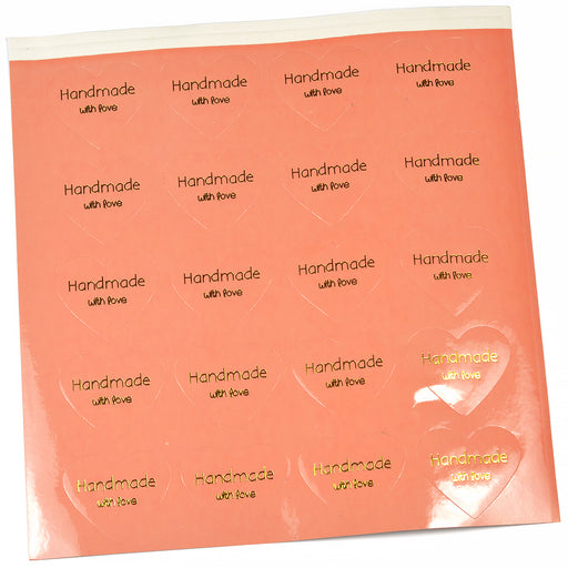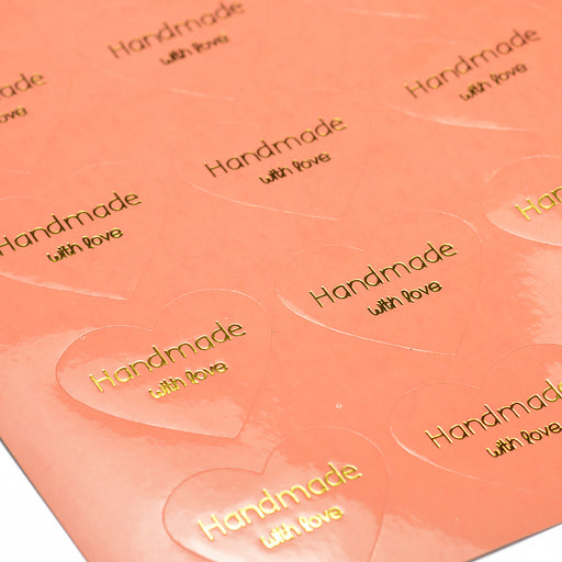 Hjärtformade klistermärken av glansigt papper (salmon) med guld glänsande text "handmade with love".Storlek per hjärta är ca 32 x 28 mm.Priset avse...