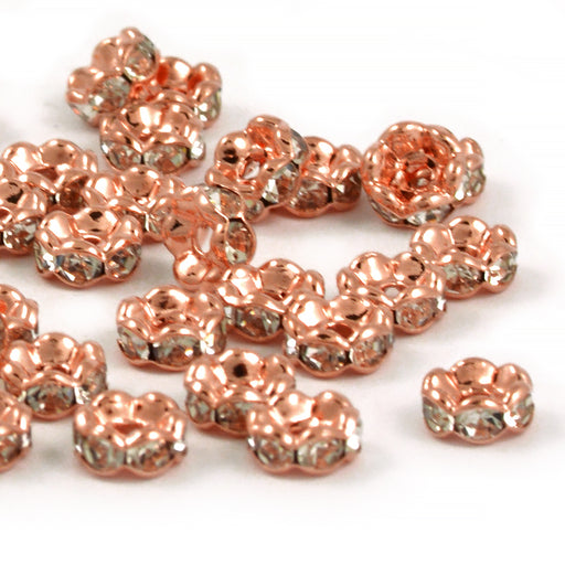 Eleganta, roséguldfärgade mellandelar, rondeller med vit strass.Vågig struktur.Storlek är ca 6 x 3 mm.Håldiameter är ca 1,5 mm.Priset avser ca 20 st.