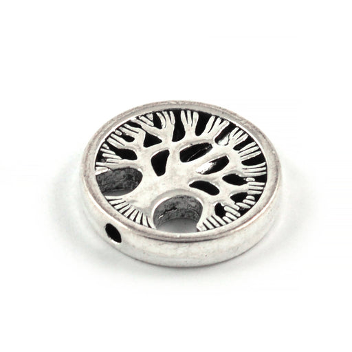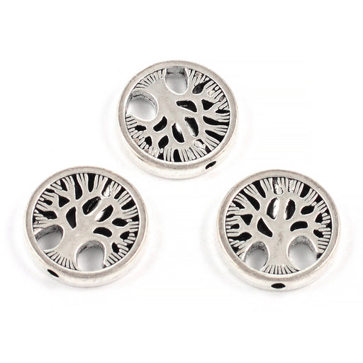 Antiksilverfärgade metallpärlor, träd eller livsträd.Diameter är ca 18 mm.Tjocklek är ca 3,5 mm.Håldiameter är drygt 1,5 mm.Priset avser 3 st pärlor.