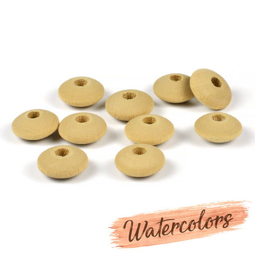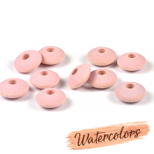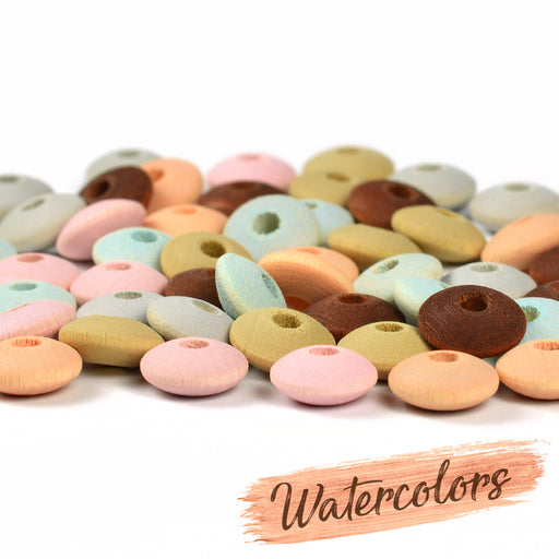 Fina trälinser, salivbeständiga och giftfria – *Watercolors* edition.Dessa pärlor är matta och trästrukturen syns något tydligare igenom den vatten...