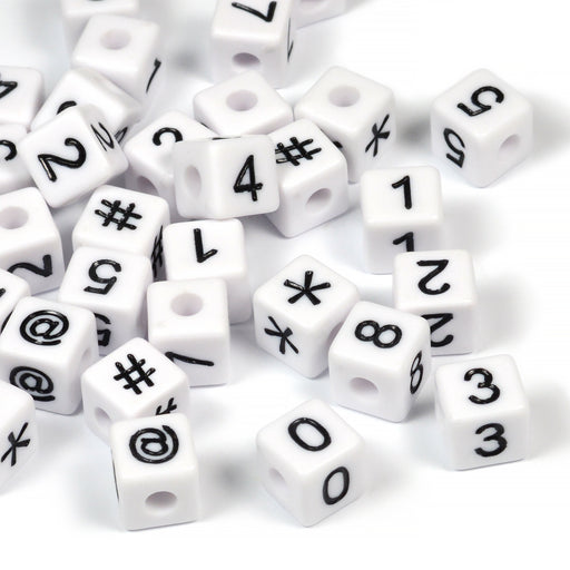 Kubformade pärlor i vit akryl.Mixade siffror 0–9 samt tecken @, * och #.Mixen är slumpmässig och vi kan inte påverka om det blir en jämn fördelning...