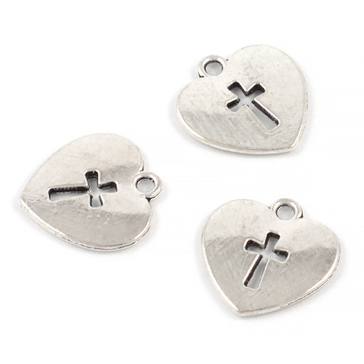 Antikt silverfärgad berlock i hjärtform med utstansat kors och ornament runtom.Storlek är ca 14 x 14 mm (plus ögla).Tjocklek är ca 2 mm.Håldiameter...