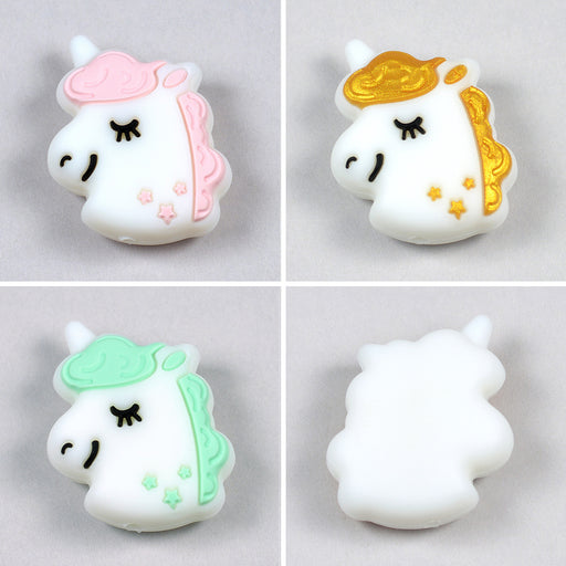 Silikonpärla i form av ett enhörnings huvud, 100% BPA-fri.Enhörningsmotiv är på en sida.Storlek är ca 26 x 21 mm.Tjocklek är ca 11 mm.Håldiameter ä...