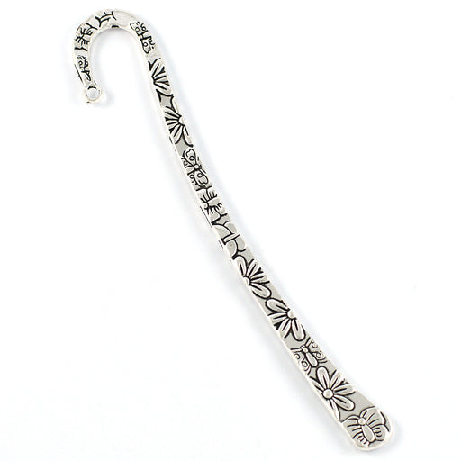 Antikt silverfärgad stomme till bokmärke med blommor och fjärilar på båda sidor.Längd är ca 124 mm.Tjocklek är ca 3 mm.Håldiameter är ca 3 mm.Välj ...