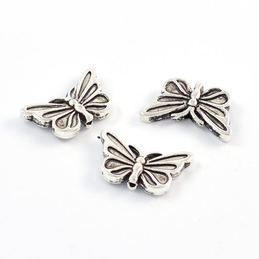 Antiksilverfärgade metallpärlor, fjärilar.Storlek är ca 17 x 10 mm.Tjocklek är ca 2,5 mm.Håldiameter är ca 1 mm.Priset avser en påse med ca 10 st.