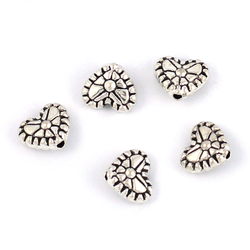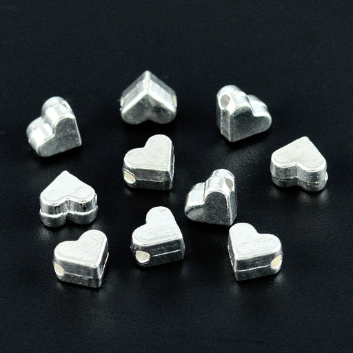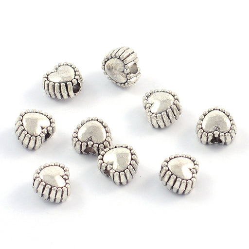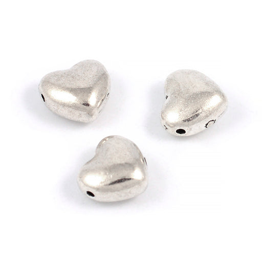 Antiksilverfärgade metallpärlor, hjärtan.Storlek är ca 10 x 9,5 mm.Tjocklek är ca 5,5 mm.Håldiameter är ca 1 mm.Priset avser en påse med ca 10 st.