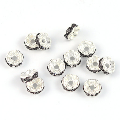 Eleganta rondeller med strass, silver-svart, 6mm, 20st
