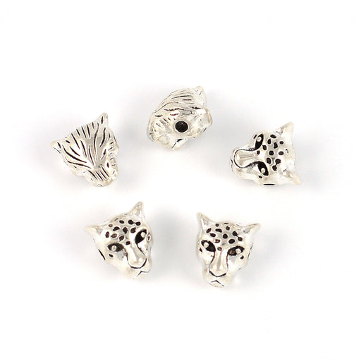 Antiksilverfärgade metallpärlor, leopardhuvud.Storlek är ca 9 x 10 mm.Tjocklek är ca 7 mm.Håldiameter är ca 1,5 mm.Priset avser en påse med 5 st.
