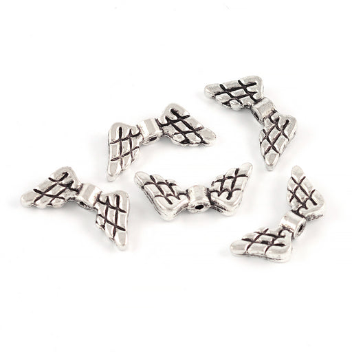 Antiksilverfärgade änglavingar.Storlek är ca 20 x 9 mm.Tjocklek är ca 2,5 mm.Håldiameter är drygt 1 mm.Priset avser en påse med ca 10 st.