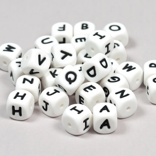 Kubformade, vita silikonpärlor med svarta bokstäver A–Ö samt Ø.100% BPA-fri.Du väljer önskad bokstav i menyn.Kantlängd är 12 mm.Håldiameter är ca 1...