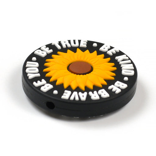 Rund silikonpärla, svart med solros och orden "Be true - be kind - be brave - be you", BPA-fritt silikon för små kliande tänder. Funkar även utmärk...