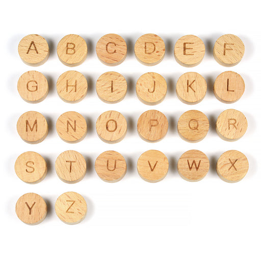 Platta, runda pärlor i obehandlat trä med ingraverade bokstäver A–Z.Du väljer önskad bokstav i menyn.Diameter är ca 15 mm.Tjocklek är ca 8 mm.Håld...