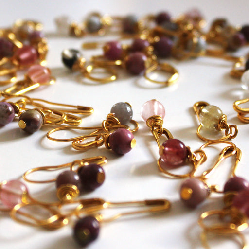 Stickmarkörer / maskmarkörer eller säkerhetsnålar i guldfärgad metall.Storlek är ca 21 x 10 mm.Materialets tjocklek är ca 0,7 mm.Priset avser ca 30...