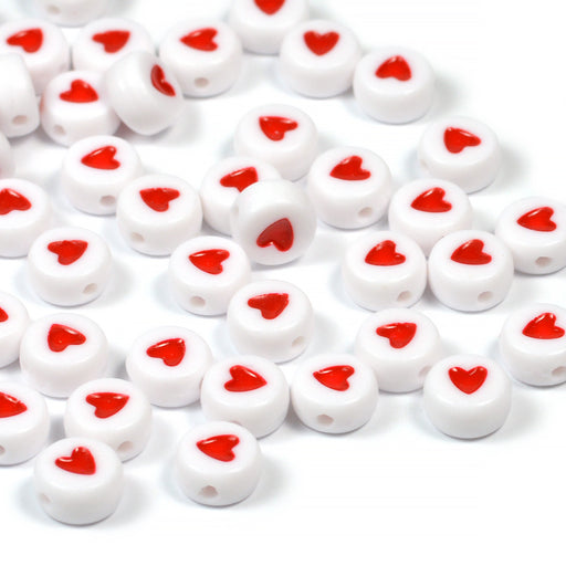 Platta, runda pärlor i akryl, vita med rött hjärta på båda sidor.Storlek är ca 7 x 4 mm.Håldiameter är ca 1 mm.Priset avser en påse med ca 100st.Ej...