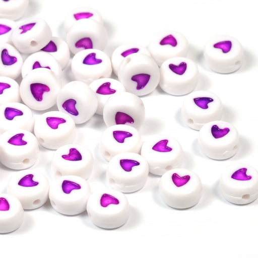 Platta, runda pärlor i akryl, vita med lila hjärta på båda sidor.Storlek är ca 7 x 4 mm.Håldiameter är ca 1 mm.Priset avser en påse med ca 100st.Ej...