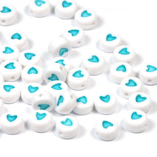 Platta, runda pärlor i akryl, vita med turkost hjärta på båda sidor.Storlek är ca 7 x 4 mm.Håldiameter är ca 1 mm.Priset avser en påse med ca 100st...