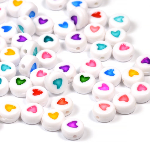 Platta, runda pärlor i akryl, vita med hjärta i blandade färger på båda sidor.Storlek är ca 7 x 4 mm.Håldiameter är ca 1 mm.Priset avser en påse me...