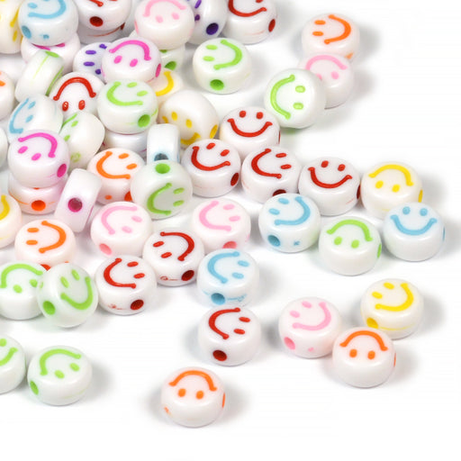 Platta, runda pärlor i akryl, vita med färgglada emoji eller smiley på båda sidor.Färgmixen är slumpmässig. Craft-style.Storlek är ca 7 x 4 mm.Håld...