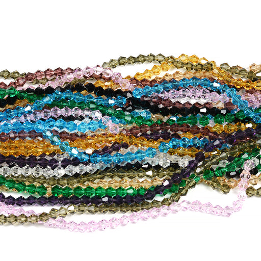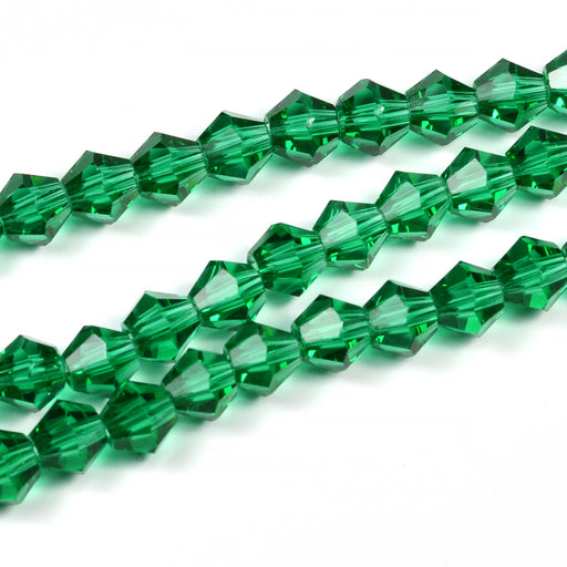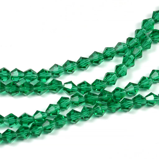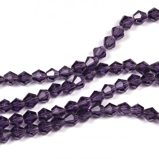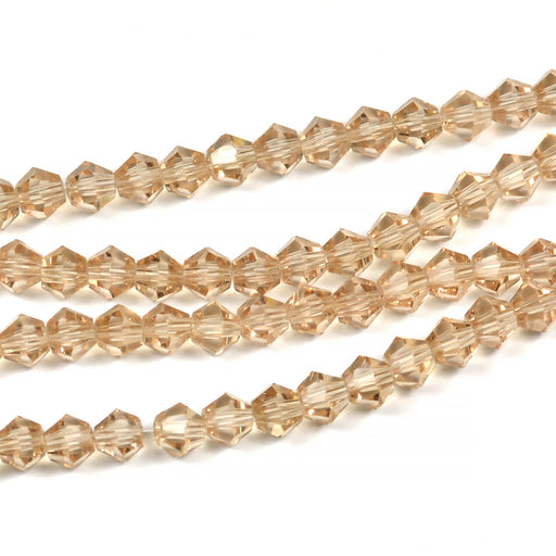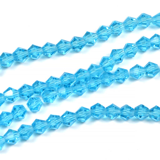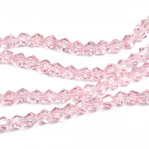 Facetterade glaspärlor "bicone".Storlek är ca 4 x 4 mm.Håldiameter är ca 0,8 mm.Priset avser en sträng som har ca 104 st pärlor.