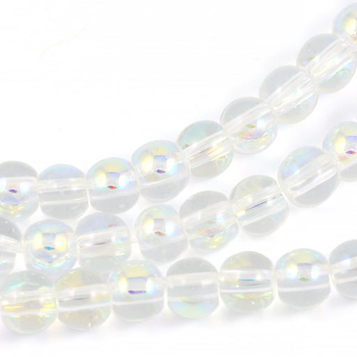 Vackert skimrande glaspärlor.Pärlorna är transparenta med fin AB-lyster.Diameter är ca 6 mm.Håldiameter är ca 1 mm.Priset avser 3 strängar med tota...