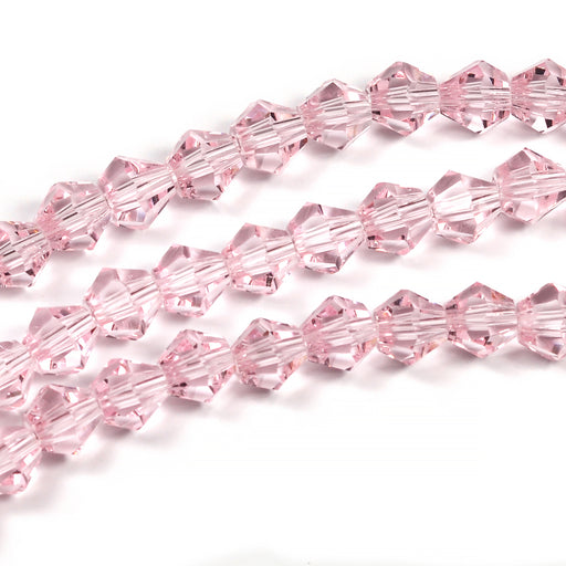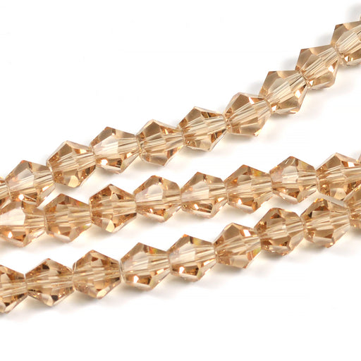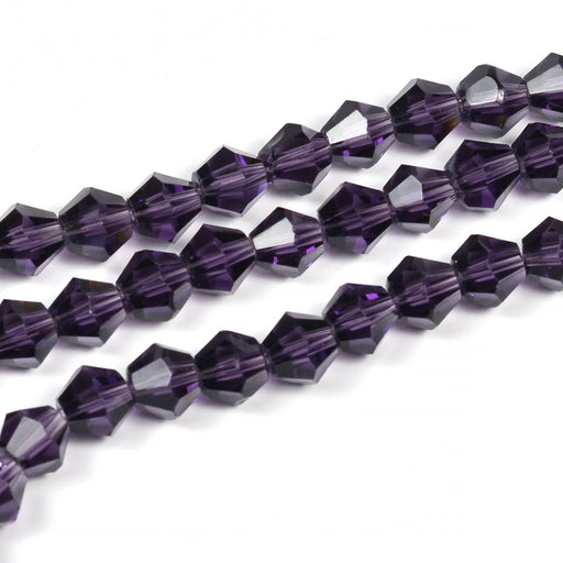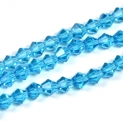 Facetterade glaspärlor "bicone".Storlek är ca 6 x 6 mm.Håldiameter är ca 1 mm.Priset avser en sträng som har ca 50 st pärlor.
