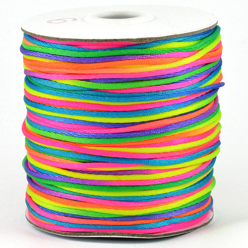 Lätt glansigt satinsnöre.Material: nylonFärg: neon regnbågeTjocklek: drygt 1,5 mm.Priset avser 5m snöre.Ej lämplig för barn under tre år.