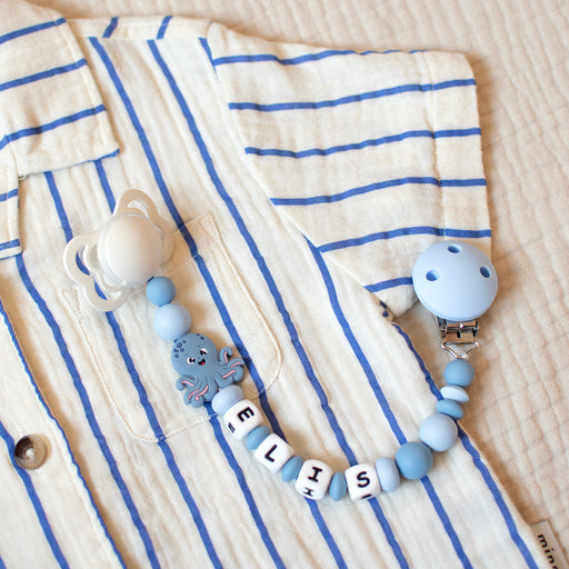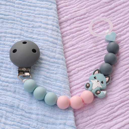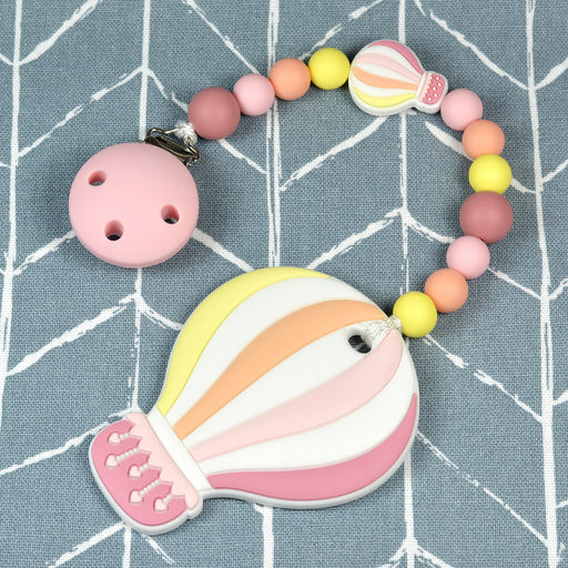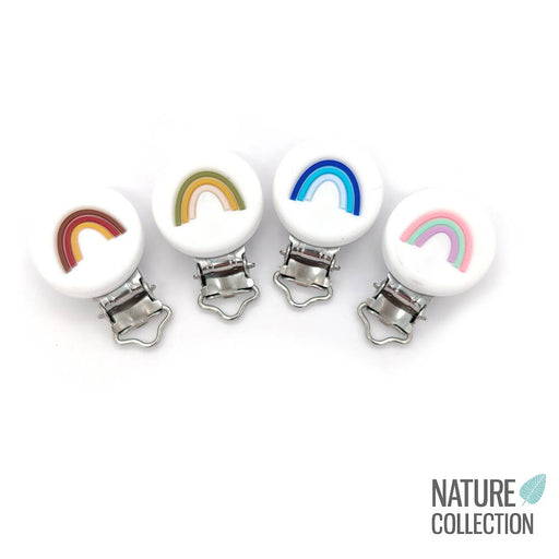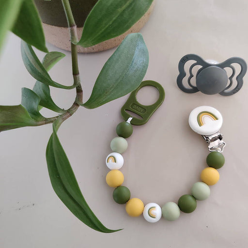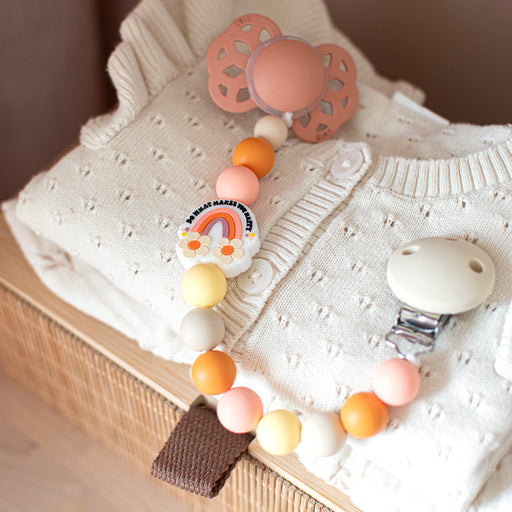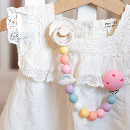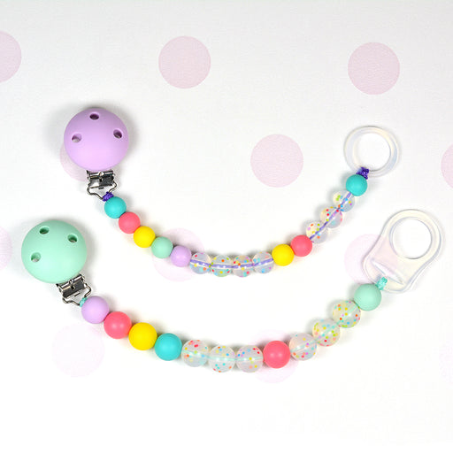 Clipset är i BPA-fri silikon samt rostfritt stål och har 3 ventilationshål.4 ränder i matchande färger till regnbågs pärlor och bitringar.Diameter...