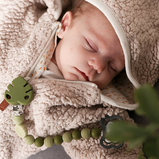 Clipset är i BPA-fri silikon samt nickel- och rostfri metall och har 2 ventilationshål.Silikondelen har formen av ett monstera blad.Storlek är ca ...