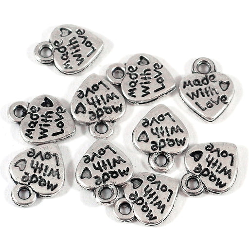 Antikt silverfärgad berlock i hjärtform med texten "Made with love" på båda sidor.Storlek är ca 10 x 12 mm.Tjocklek är ca 2 mm.Håldiameter är ca 1,...