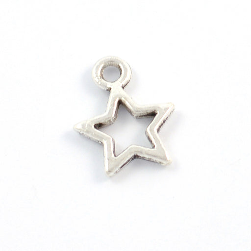 Antikt silverfärgad berlock i stjärnform.Storlek är ca 10 mm.Tjocklek är drygt 1 mm.Håldiameter är drygt 1 mm.Priset avser ca 20st.Ej lämplig för b...