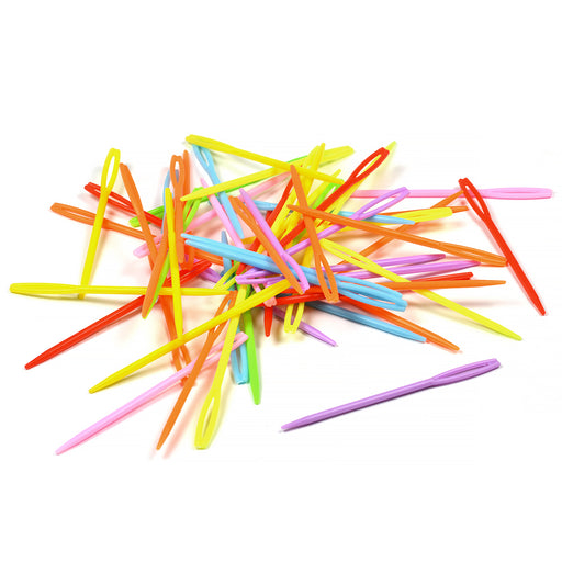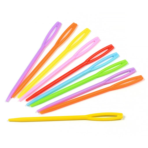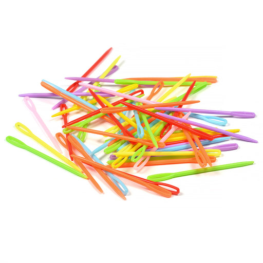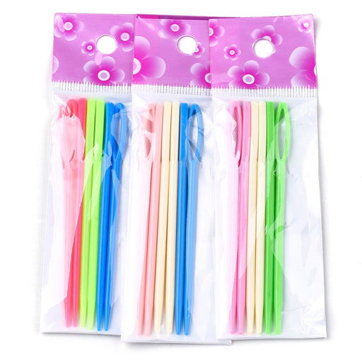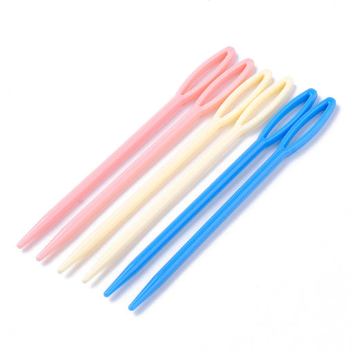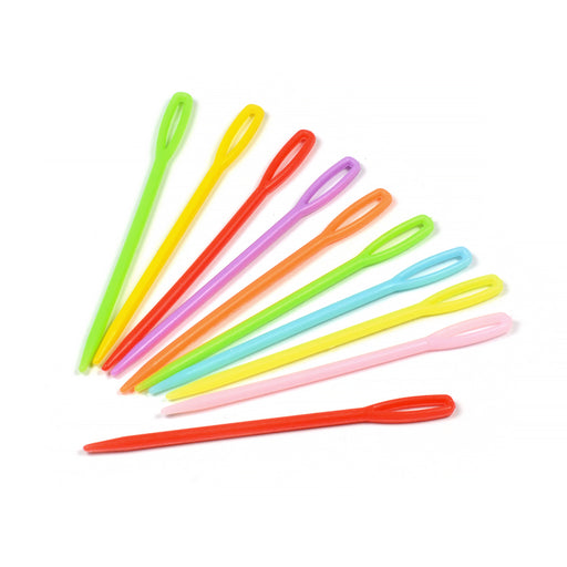 Färgglada plastnålar i slumpmässigt mixade färger för montering av exempelvis virkade eller stickade skapelser. Lite större modell med 90 mm läng...