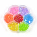 Liten pyssellåda med akrylpärlor i glansiga, transparenta färger och hjärtform.